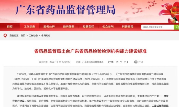 据了解,广东省药监局曾于2017年印发《广东省食品药品检验检测机构能力建设标准(2016-2020年)》,并在2019年承担国家药监局药械化检验检测机构能力建设指导原则的起草工作。