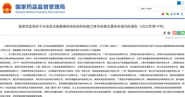 而在2022年3月国家药监局发布的《关于化妆品注册备案检验检测机构能力考评结果处置有关情况的通告》结果显示:46家检验检测机构暂停该检验检测机构的化妆品注册备案检验信息系统使用权限。12家机构被要求进行整改。