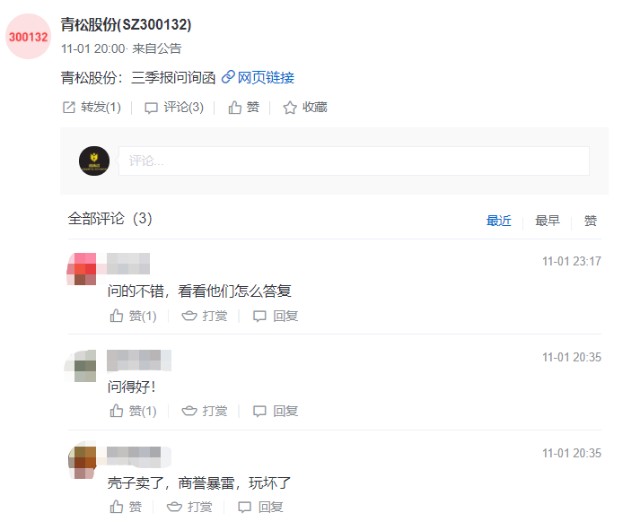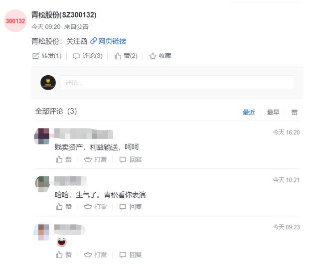 对于深交所的问询,不少投资者表示了支持,还有人调侃称“问的不错,看看他们怎么答复”、“壳子卖了,商誉暴雷,玩坏了”、“贱卖资产,利益输送”、“哈哈,生气了。青松看你表演”。
