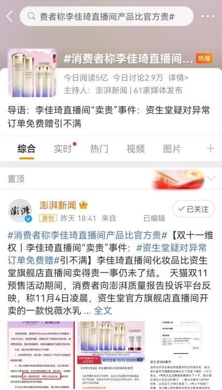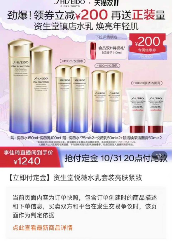 天猫双11预售活动期间,有消费者在网上发文称11月4日凌晨,资生堂官方旗舰店直播间开卖的一款悦薇水乳套装只需888元,比李佳琦直播间的同款商品到手价便宜300多元。