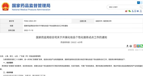 近日,国家药监局综合司关于开展化妆品个性化服务试点工作的通知。