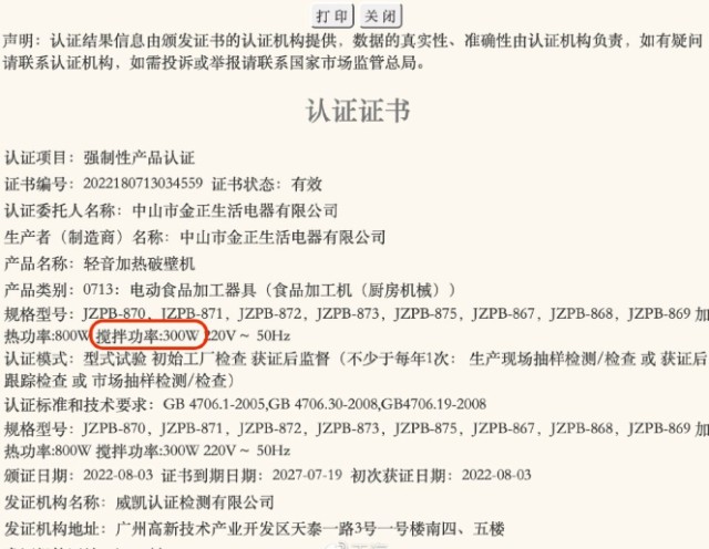 经查询,金正破壁机的3C认证信息——型号JZPB—869。王海认为,证书编号为2022180713034559的3C认证证书是发给电机功率300W的!这意味着疯狂小杨哥卖的这款金正破壁机不仅虚假宣传,属于以次充好的伪劣商品,还是假冒/冒用3C认证的产品。