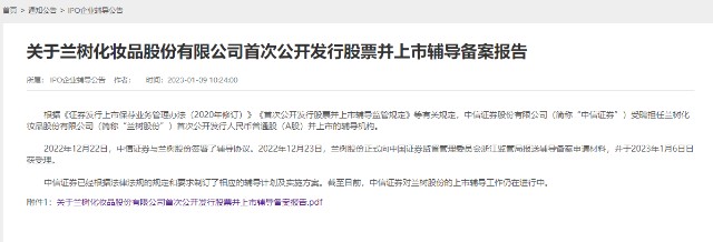 据2023年1月9日发布的《关于兰树化妆品股份有限公司首次公开发行股票并上市辅导备案报告》显示:2022年12月22日,中信证券与兰树股份签署了辅导协议。2022年12月23日,兰树股份正式向中国证券监督管理委员会浙江监管局报送辅导备案申请材料,并于2023年1月6日日获受理。