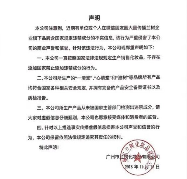 2018年11月15日,广州市兰树化妆品有限公司(以下简称“广州兰树”)迅速发出声明:“兰树公司各品牌产品不存在添加国家禁止添加违禁成分的行为,网络流传图片是人为捏造,并将对造谣者追责。”
