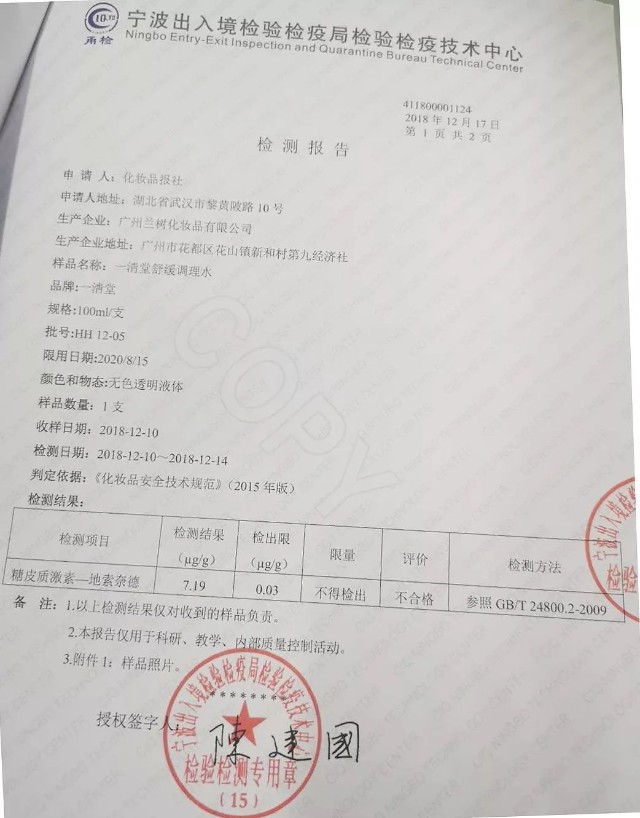 但故事并没有完,2018年12月17日,化妆品行业唯一有新闻采访资质的《化妆品报》送检的两款自购的淮树鱼腥草润颜水和一清堂舒缓调理水,经过宁波出入境检验检疫局检验检疫技术中心检测后,发现产品里检出糖皮质激素地索奈德。其中,生产批号为SAC16-02的淮树鱼腥草润颜水含有糖皮质激素地索奈德3.95微克/克,生产批号为HH12-05的一清堂舒缓调理水含有糖皮质激素地索奈德7.19微克/克。