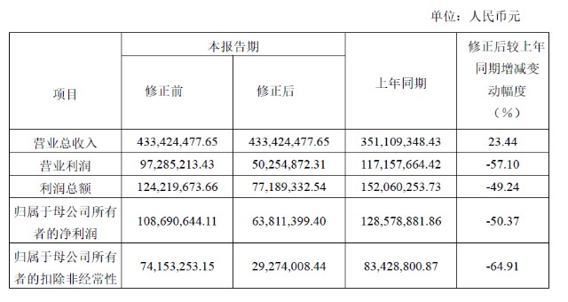 修正后嘉必优2022年归属于母公司所有者的净利润6381.14万元,同比减少50.37%;归属于母公司所有者的扣除非经常性损益的净利润2927.4万元,同比减少64.91%。