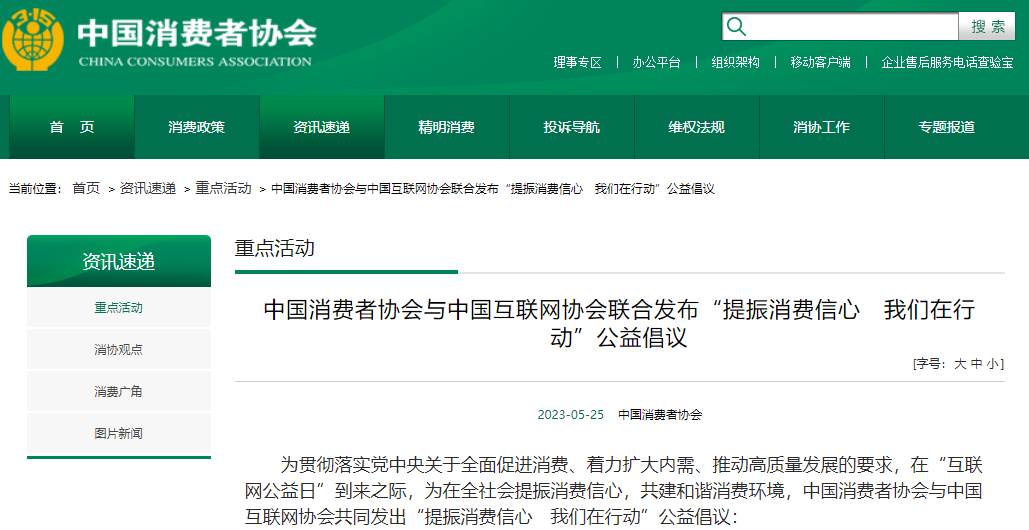 2023年5月25日,为贯彻落实党中央关于全面促进消费、着力扩大内需、推动高质量发展的要求,在“互联网公益日”到来之际,为在全社会提振消费信心,共建和谐消费环境,中国消费者协会与中国互联网协会共同发出“提振消费信心 我们在行动”公益倡议: