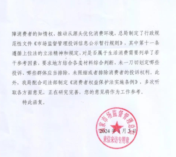 对此,在2024年1月3日,市监总局作出《信访回复意见书》(国市监信复函〔2023122612261〕)称,为保障消费者的知情权、推动从源头优化消费环境,总局制定了行政规范性文件《市场监督管理投诉信息公示暂行规则》,其中第十一条遵循上位法的立法精神和规定,对是否属于生活消费需要列举了若干参考因素,要求地方结合各类材料综合判断,未一刀切划定哪些投诉、哪些群体应当排除,未限缩或者排除消费者的投诉权利。此外,我局配合司法部制定《消费者权益保护法实施条例》,多次听取各方面意见,正在研究完善,您的意见将作为工作参考。