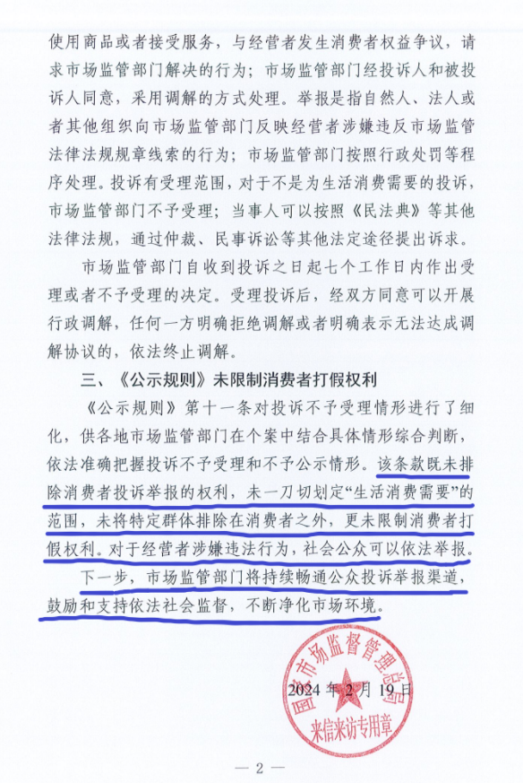 而在2024年2月19日,市监总局回复(国市监信复函PPJY2023038)史瑞杰称,《市场监督管理投诉信息公示暂行规则》第十一条,既未排除消费者投诉举报的权利,未一刀切划定“生活消费需要”的范围,未将特定群体排除在消费者之外,更未限制消费者打假权利。对于经营者涉嫌违法行为,社会公众可以依法举报。下一步,市场监管部门将持续畅通公众投诉举报渠道,鼓励和支持依法社会监督,不断净化市场环境。