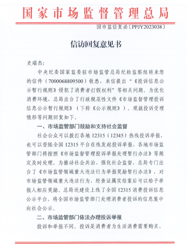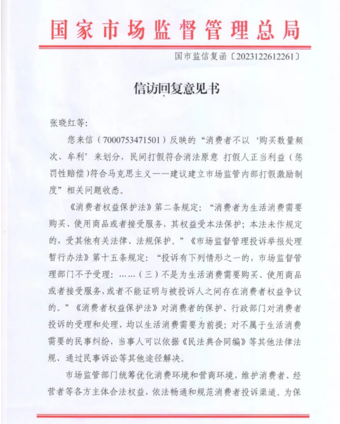 就在消法条例(草案)审议通过的前几天,有网友就市场监管系统出现的限制消费者打假监督权利等问题上书中央纪委国家监察委,中纪委国家监察委驻国家市场监管总局纪检监察组将上述问题批转至国家市场监管总局,国家市场监管总局书面回复称,未限制消费者打假权利,未将特定群众排除在消费者之外。