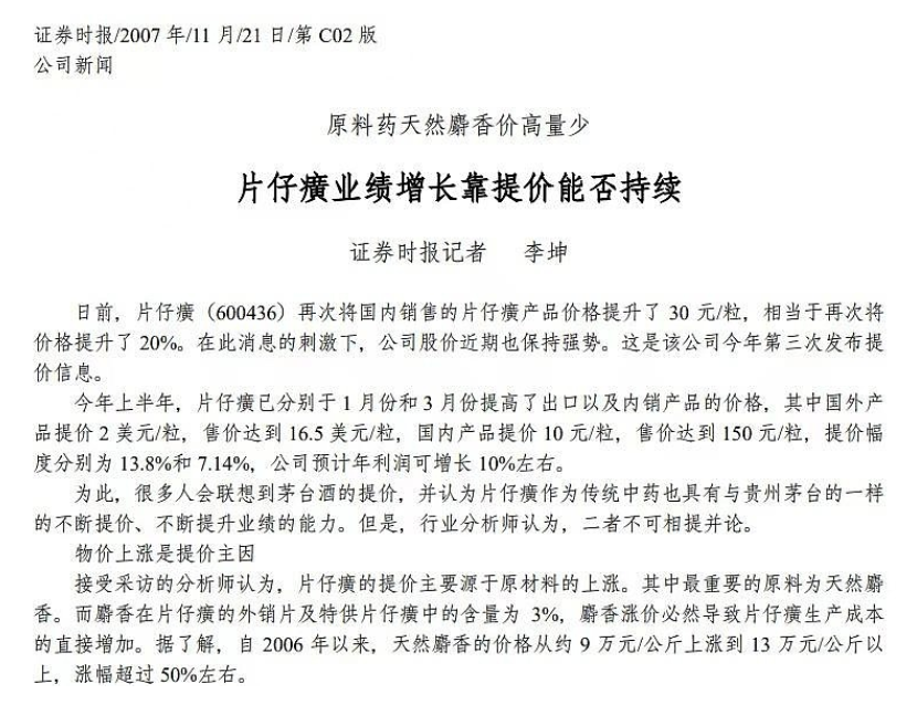 不过,也有投资者认为,每次提价之后,在片仔癀的销量下滑之后,都会有声音出来说片仔癀业绩增长不可持续,但实际上每过一两年提价之后销量又会继续创新高。其根本原因是片仔癀具有垄断性,片仔癀产品的保健属性强,从供求关系上来讲,片仔癀还远没有到达天花板,而且未来还有很大的提价空间。并晒出了2007年证券时报关于“片仔癀业绩增长靠提价能否持续”的报道,加以佐证。
