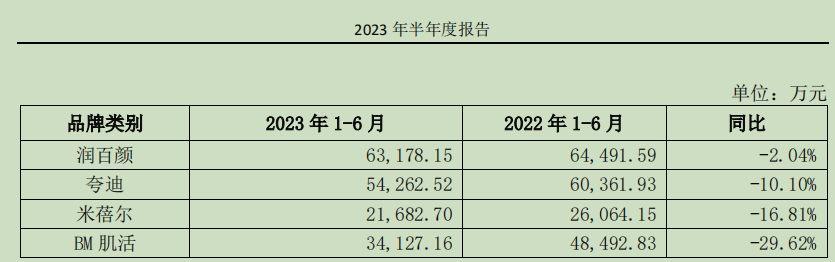 值得关注的是,在2023年年报中,华熙生物不再披露具体化妆品品牌的营收情况。而此前,华熙生物无论在年报还是半年报中,都有披露旗下润百颜、夸迪、米蓓尔和BM肌活的营收情况。