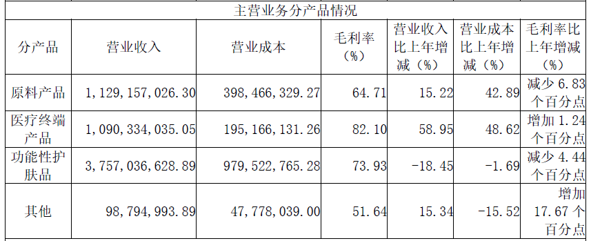 其中,原料产品实现收入11.29亿元,同比增长15.22%,毛利率64.71%,同比减少6.8个百分点;医疗终端产品实现收入10.90亿元,同比增长58.95%,毛利率82.1%,同比增长1.24个百分点;功能性护肤品实现收入37.57亿元,同比减少18.45%,毛利率73.93%,同比减少4.44个百分点;功能性食品业务实现收入0.58亿元,同比下降 22.53%。