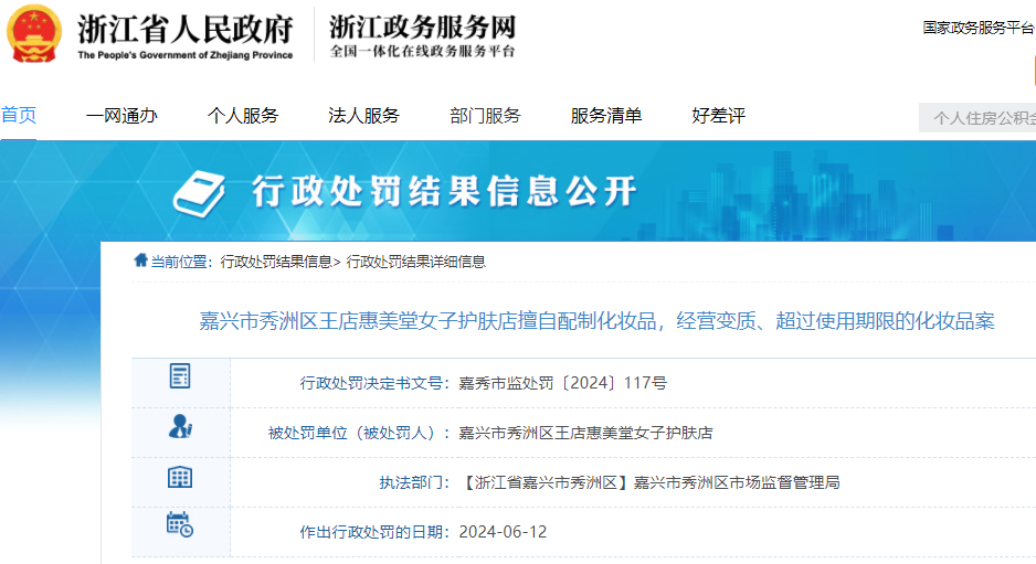 2024年6月12日,浙江政务服务网公示了一个“经营超过使用期限的化妆品”的行政处罚。