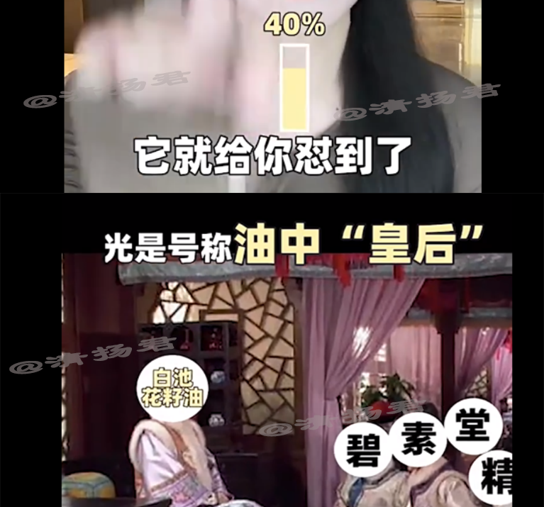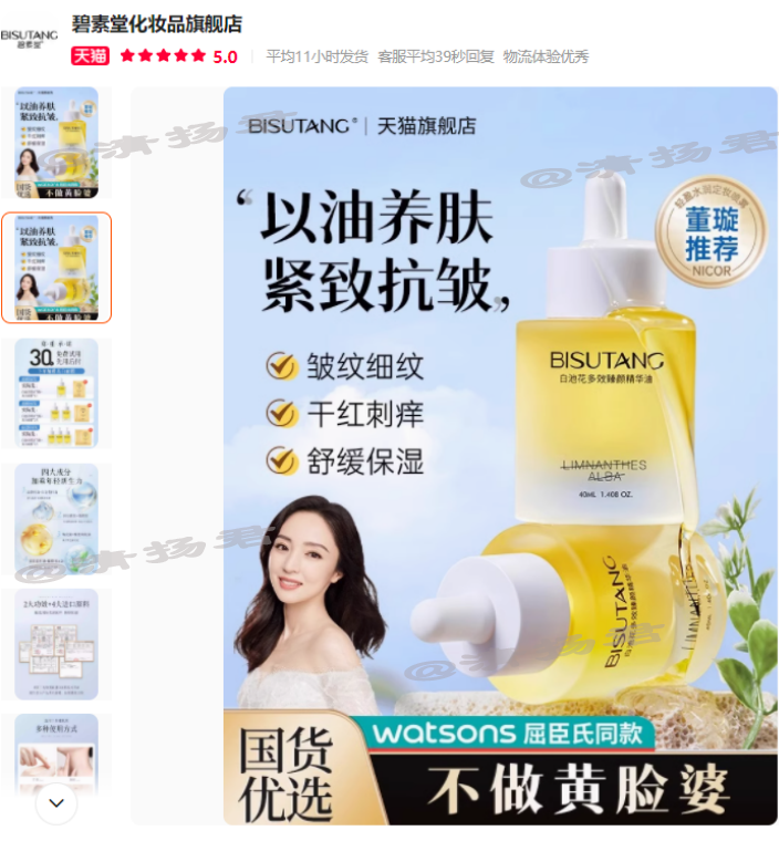 据阳先生讲,在其浏览“碧素堂化妆品天猫旗舰店”时,发现“碧素堂白池花多效臻颜精华油”的主图缩略图上,注明有“屈臣氏同款”和“董璇推荐”字样,并在视频中宣传“光是号称油中的‘皇后’白池花籽油,它就给你怼到了40%。那抗氧修复力,不得拔高好几个LEVEL。”