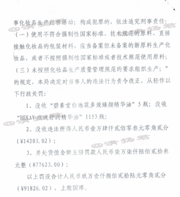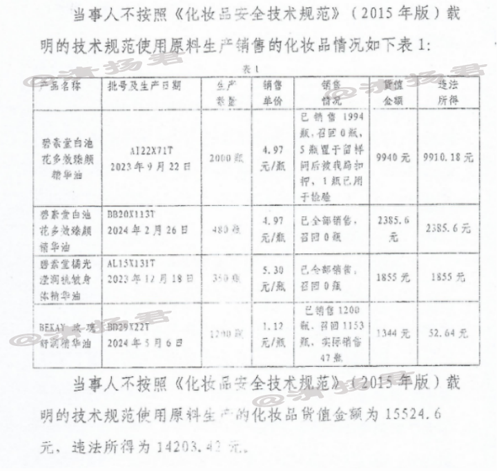 《行政处罚决定书》(四市监江谷处罚[2024]11号)显示,认定生产厂家广东碧素堂生物科技有限公司存在不按照《化妆品安全技术规范》使用原料和不按照《化妆品生产质量管理规范》组织生产两项重大违规行为。尽管工厂积极配合调查,监管部门决定从轻处罚,没收违法所得并处货值金额五倍罚款,合计罚没款9.18万元。