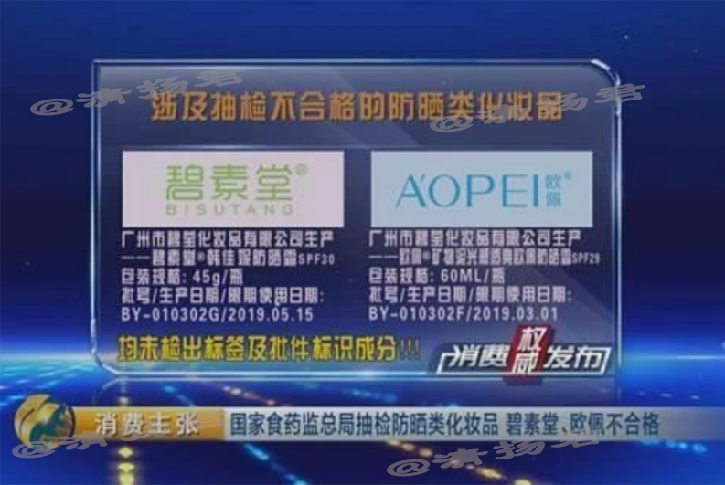 2017年,国家食药监总局抽检防晒类化妆品,碧素堂韩佳妮防晒霜和欧佩矿物泥光感透亮欧佩防晒霜,因未检出标签及批件标识成分,还被央视财经报道。