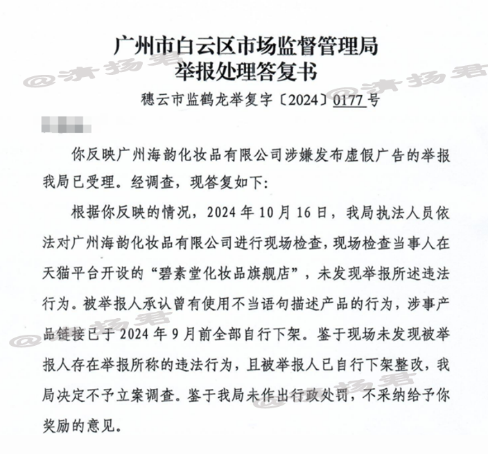 行政处罚决定书《穗云市监鹤龙举复字【2024】0177号》显示,广州市白云区市场监督管理局依法对广州海韵化妆品有限公司进行现场检查,当事人承认曾有使用不当语句描述产品的行为,涉事产品链接已于2024年9月前全部自行下架。遗憾的是,监管部门并未明确究竟哪些宣传违法,同时也并未对其立案。