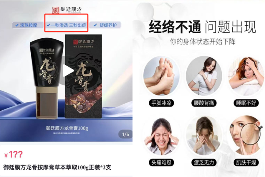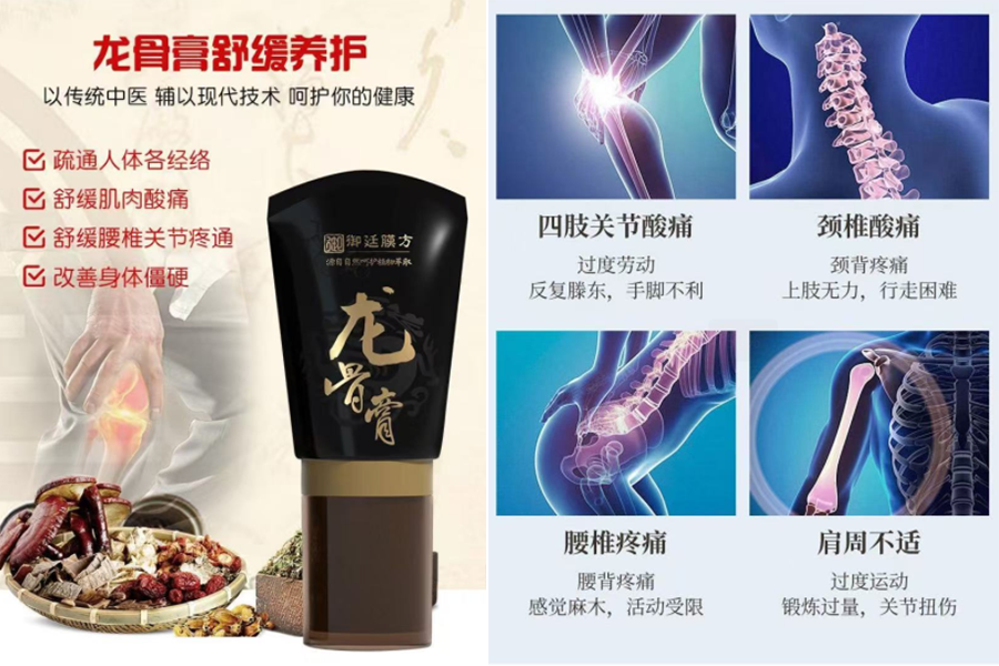 阿朱直播间里,义父的“御廷膜方”系列被包装成了“健康神器”。例如,龙骨膏号称能“疏通经络”“改善腰椎疼痛”,亲肤霜被贴上“抗菌抗炎”“延缓衰老”的标签,普通洗发液更是承诺“强根健发”。然而,这些描述早已超出化妆品“清洁、保护、美化”的法定功能范畴,直接踩中《化妆品监督管理条例》的红线——非特殊用途化妆品不得宣称医疗效果。