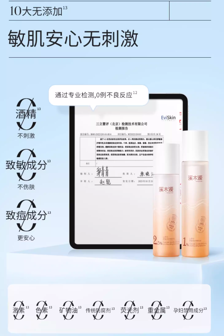 反观化妆品行业,“0添加”概念仍在野蛮生长。溪木源作为敏感肌护理领域的头部品牌,其大量产品宣传中随处可见“0酒精、0致敏成分”等表述。