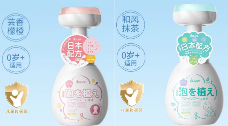 清扬君发现,目前逗儿部分产品“哈日”现象严重。如DOUER逗儿宝宝花朵泡泡洗发沐浴露(芸香檬橙)、DOUER逗儿宝宝花朵泡泡洗发沐浴露(和风抹茶)。从逗儿天猫旗舰店展示的产品正面图来看,不论文字还是图形,几乎都是日本元素。通过药监局官网查询发现,该两款产品的备案编号分别为“粤G妆网备字2020223729”和“粤G妆网备字2020223730”,备案人和生产企业均为广东雅丽洁精细化工有限公司。