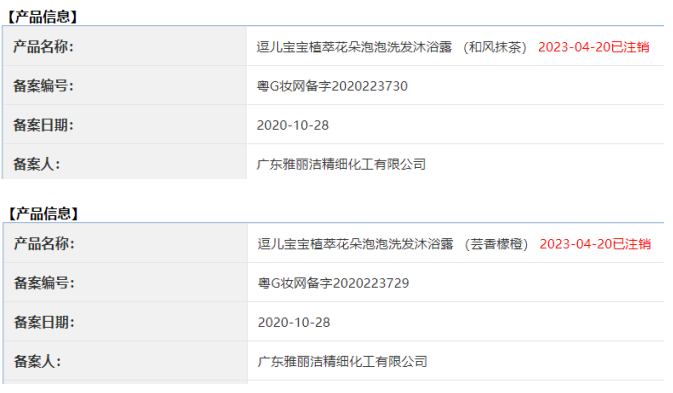 不仅如此,雅丽洁还极有可能涉嫌生产销量已注销备案的逗儿产品。