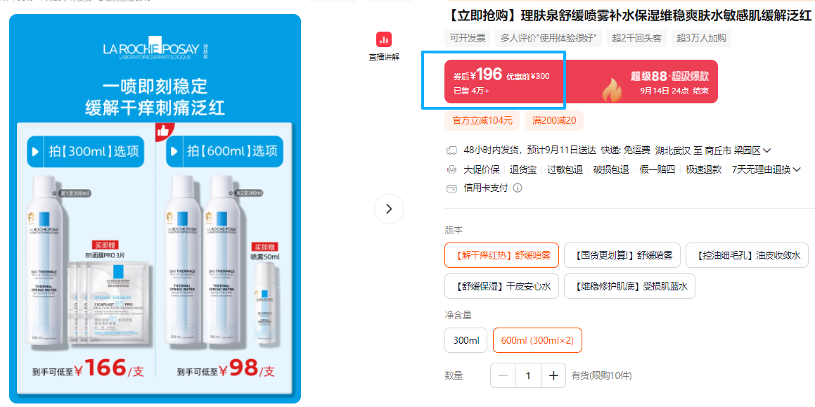 从市场表现来看,这款喷雾堪称理肤泉的“明星”产品。在欧莱雅经营的理肤泉天猫官方旗舰店,300毫升舒缓调理温泉水喷雾单品优惠后166元,两瓶装优惠后196元,实际每瓶98元,已热销超4万单。