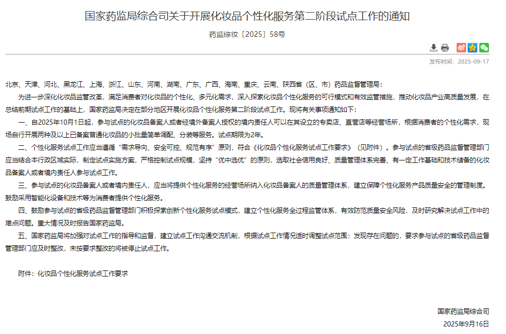 9月16日,国家药监局综合司发布公告称,10月1日起,化妆品个性化服务第二阶段试点正式启动。这一次,试点范围扩大了,规则更明确了,期限也定了——整整两年。这意味着什么?意味着家门口的化妆品专卖店,可能很快就能为你“量肤定制”专属面霜或精华。而这背后,隐藏着一场关于美妆行业未来格局的深度博弈。