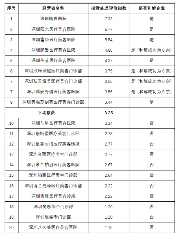 深圳医美行业投诉处理排行榜出炉!平均投诉处理评价指数不理想
