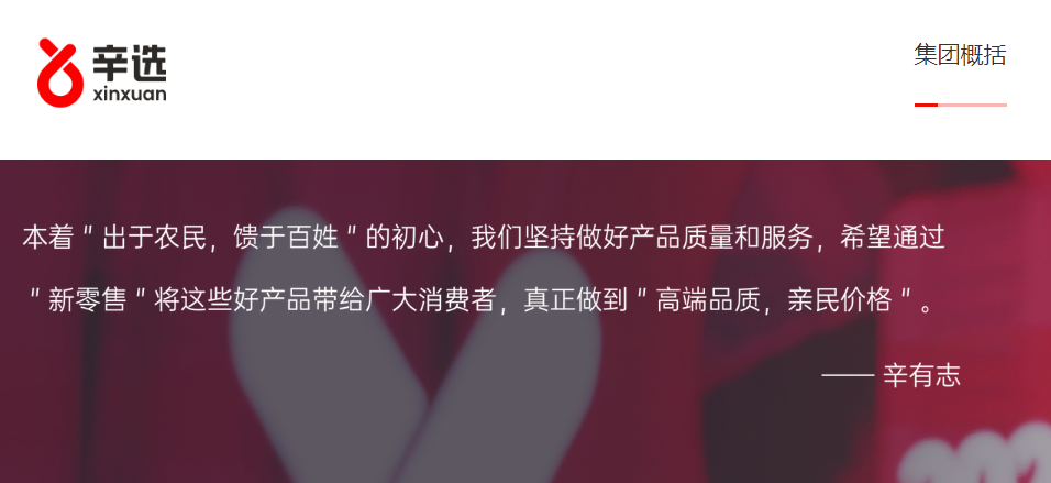 辛选官网自称是“以供应链为核心的数字零售企业”,创始人辛有志也更把“出于农民,馈于百姓”的初心挂在官网宣传,誓言以“新零售”实现“高端品质、亲民价格”。口号响亮,板块齐全,表面光鲜。
