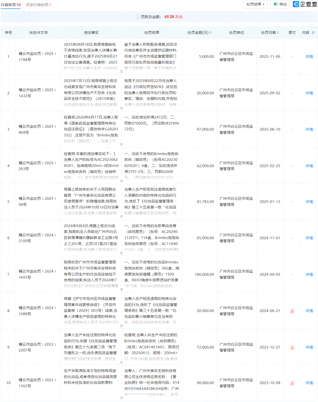 穗云市监处罚﹝2024﹞2100号行政处罚书显示,2024年11月1日,因生产不合格化妆品,广州奥采被白云区市场监管局罚款65000元;