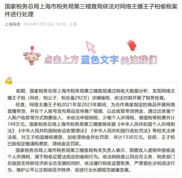 还记得他吗?曾经的“柏公子”,本名王子柏,在视频里把奢侈品、豪车、高端服饰当日常,硬生生给自己贴了个“富豪”标签,圈了近300万粉丝。结果呢?2024年5月,账号因违规被平台封禁。这还没完,同年12月,上海税务部门通报坐实其偷逃税749万元,罚款1330万元。这铁证如山的数据,无异于对其精心打造的“富豪”人设的一次狠狠打脸。