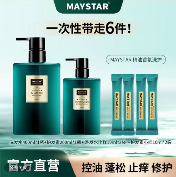 Maystar品牌在抖音设立的官方旗舰店中,对其旗下备案编号为“粤G妆网备字2023451027”的MAYSTAR香氛精油洗发露(邂逅)进行了产品宣传,页面明确标示该洗发露具备“控油、蓬松、止痒、修护”等功效。