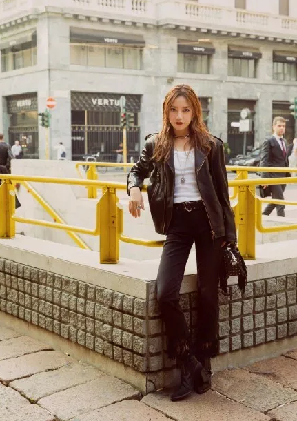 赵薇的皮衣黑裤短靴,倒是让人眼前一飒,比起以往要么套着宽袍子,要么穿着长风衣,这一回虽一身黑,倒是可以入红榜了。