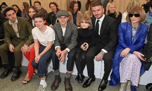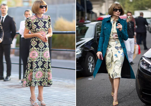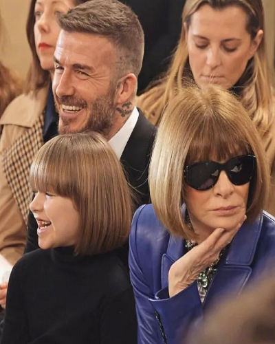 还与坐在一旁看秀的《Vogue》主编安娜·温图尔撞发型,画面十分有趣,像是一个Mini