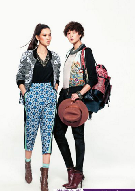 精致的工笔写意花卉翩然落于衣摆,黑色的哈伦长裤与黑色的袖笼自然衔接过渡,服装搭配帅气的尖头短靴、大大的铆钉背包,浪漫与中性气质完美融合呈现。