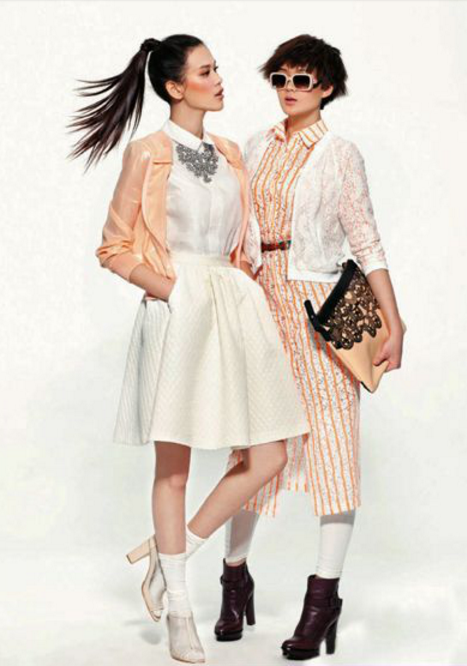 薄而透的白色蕾丝夹克外套,搭配夺目的橘色条纹衬衫,长与短的比例层叠搭配,鲜艳的色彩也通过镂空的缝隙跳跃出来。淡橘色的蕾丝手拿包,白色打底LEGGING,层次感成为混搭的重头戏。