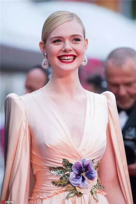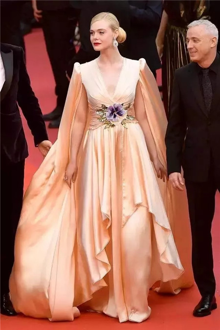 有一张盛世美颜的Fanning,一身Gucci特别定制的斗篷设计礼服长裙轻盈飘逸,腰部的精致花朵元素与蓬蓬袖设计的斗篷,在浪漫当中增添了一份公主般的典雅与俏皮。