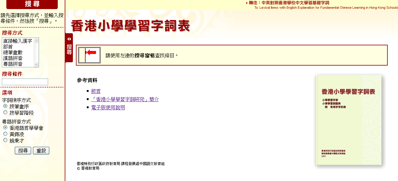 還有是它有普通話和粵語讀音,點選 http://www.edbchinese.hk/lexlist_ch/assets/Volume16.gif 即可.