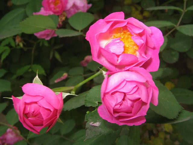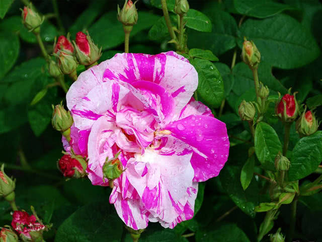 法国蔷薇花梗直立粗壮,被腺毛;花直径4-7厘米;萼筒和萼片外面有腺,萼片常有多数裂片;花瓣粉红色或深红色。果近球形或梨形,亮红色,萼片脱落。原产中欧、南欧及西亚,栽培历史悠久,园艺品种很多。有重瓣及半重瓣者。