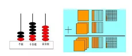 第二类:一是用计数器(下左图)先拨1.25(浅色珠子),1在个位上,2在十分位上,5在百分位上;再拨2.4(深色珠子),计数器上合起来就是3.65。