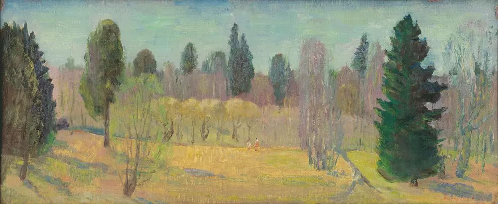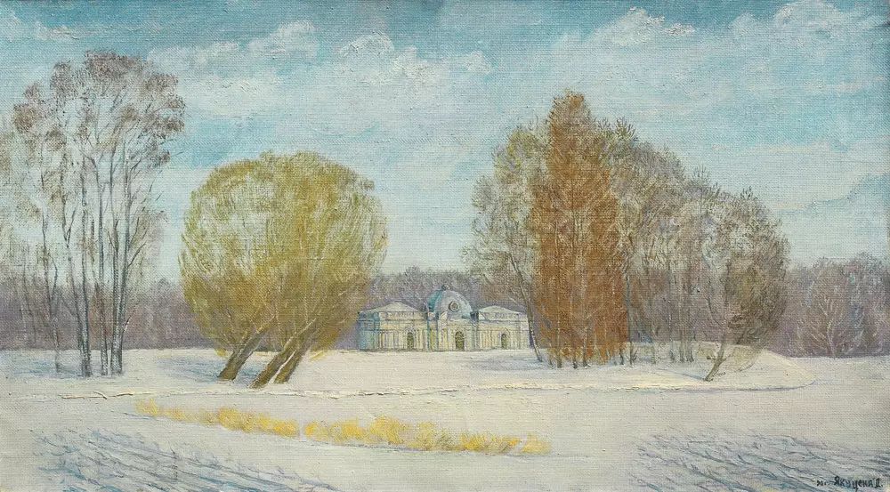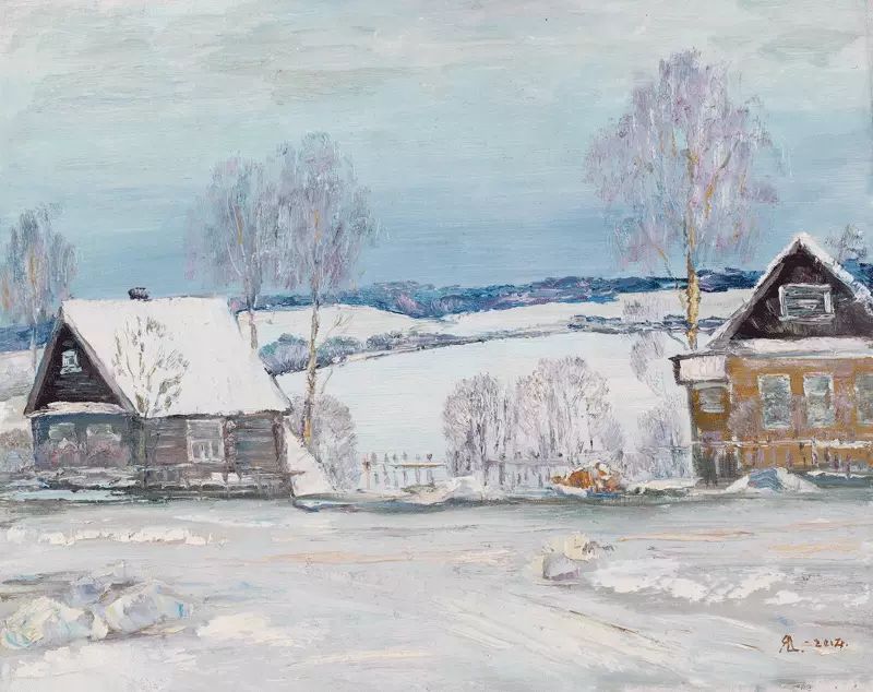 它以银灰色的调子描绘格洛特雪景,雪地上的松和远处的雾气,烘托出作品蓬松柔美的气氛。作品的基调轻柔空灵,说不出是优雅亦是轻快,仿佛漫步在格洛特的一个晴天,温柔敏感的空气在鼻尖流动徘徊,轻轻向远处的房屋走去,每一脚步都是浪漫,也是温柔,生怕碰碎了画家的梦境,震落了远方还在冬眠的稀松黄叶。身后的树干倒影舒朗,倒像是和画家的嘻戏,调皮地映在眼底,弱化了最远处朦胧沉睡的树林,细腻的灰紫色调处理的也颇为温和,却分明和这片雪野拉开了大片距离,令画面退远。画面空灵却不轻浮,画家用并不浓烈的灰蓝色调,一笔笔锤炼出简约的雪场风情,迷人丰盈。