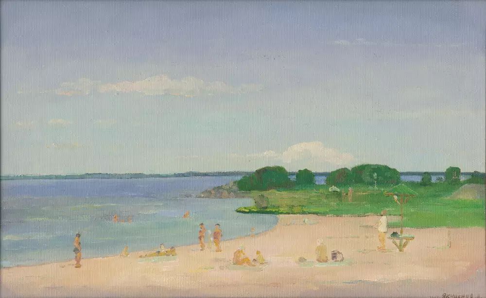假日的海滩边,游人的肌肤与沙滩颜色相近,画家仅用寥寥几笔勾勒出游人的生动姿态,闲适的慢生活节奏。整幅画作只由浅蓝的天空、海边的绿茵地、清凉的灰蓝海水,休闲的沙滩几组大色块构成。简单明快,并不是说灰色调的情感一定表达某种哀伤凄冷的情绪,在这幅作品中。我们看到了自由和活力。