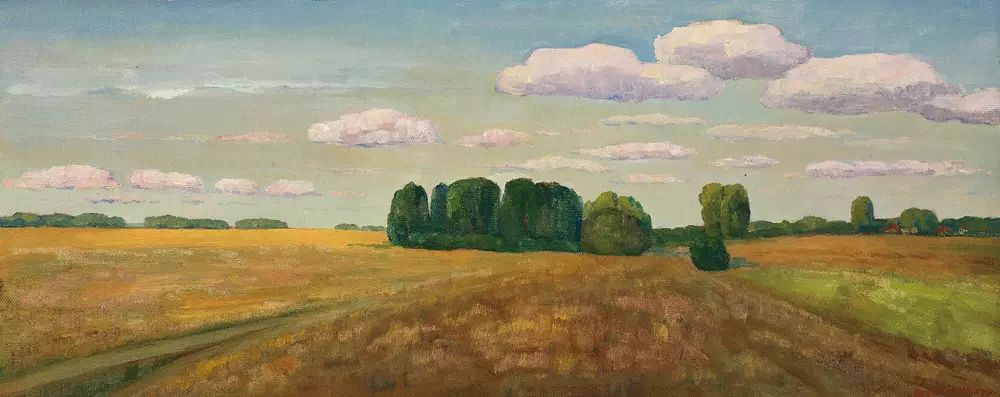 画作呈现农庄田园风光,远景金色的麦浪、整齐矮小的田埂,一派生机的景象以灰绿色和棕色为主体,光线由暗转明。随意而雅致。整幅作品色调略带有中性色彩,稍纵即逝的画面节奏感与空间感,将观赏者的感官全部激发,与画作中的空间融为一体。