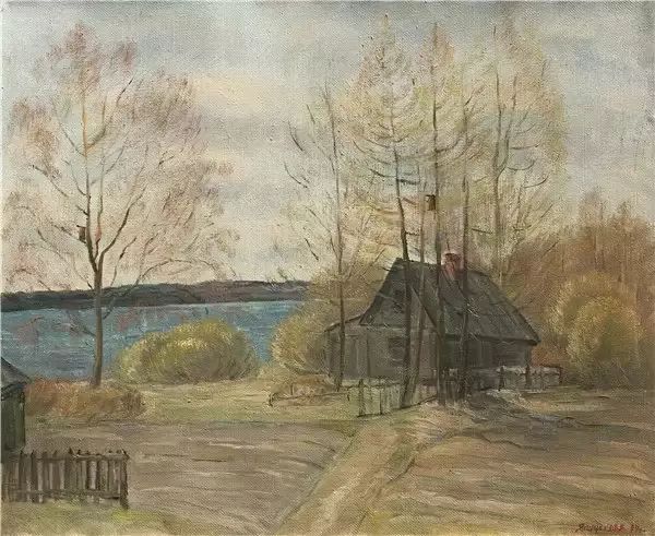 画面颜色构成简洁老练,笔法果断,银色调的雪景烘托出了清晨降临之前的短暂安宁,和谐的银灰色基调让人爱不释手。在这样的情景下,都不忍心唤醒屋中沉睡的猎户。灰色调中又层次分明的反映出雪地细腻的变化,尤见地下的泥土和远处山林的复苏。