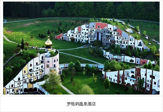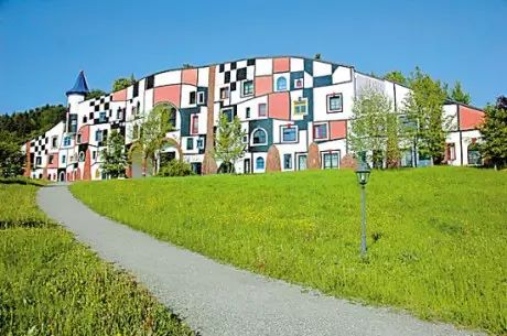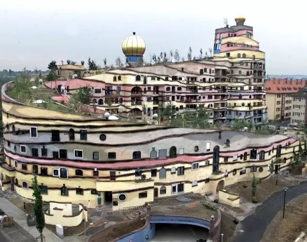 这组螺旋式房屋是百水生前最后的作品,共有105个房间组成,里面还有1个庭院、一条溪流、一个餐馆和酒吧,屋顶种满了绿草和灌木丛。