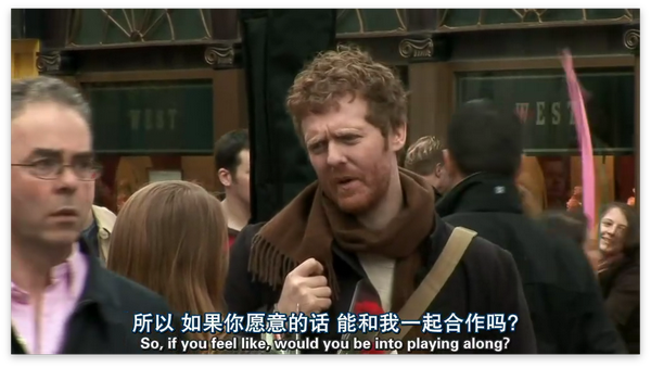 电影的开始,男主人公是爱尔兰首府都柏林街头的一名卖唱艺人,终日穿着牛仔裤,背着一把吉他,努力地生活,就算这么穷困潦倒,还是会被人抢劫。