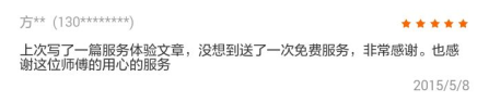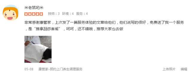 为了感谢这位小姐,我们免费提供了一次“推拿刮痧套餐”上门服务,这位方小姐也是被我们感动了,于是去大众点评和我们的微信平台给了好评。