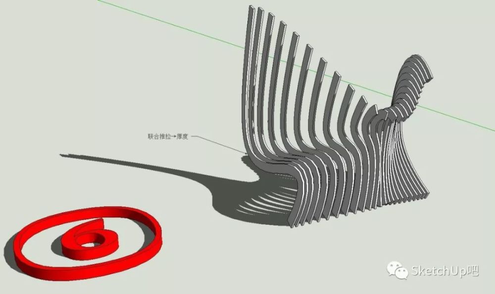 第三步:利用Fredo6插件集(SUAPP编号155)里曲线放样,成面,仅选择单向结构线,封面,最后超级推拉(SUAPP编号94)联合推拉,给厚度。