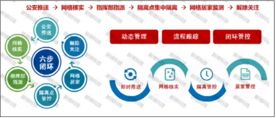 针对涉疫人员,通过公安机关推送涉疫人员信息—>社区(网格)上门核实—>指挥部指派隔离点—>隔离点落实集中隔离管控—>推送社区居家健康监测—>解除关注的“六步闭环”管控,真正实现协同管控全联动;针对“应检尽检”工作人员,由责任部门牵头,落实相关单位做好督查工作,开展全流程闭环管理,确保“应检尽检”,管控到位。